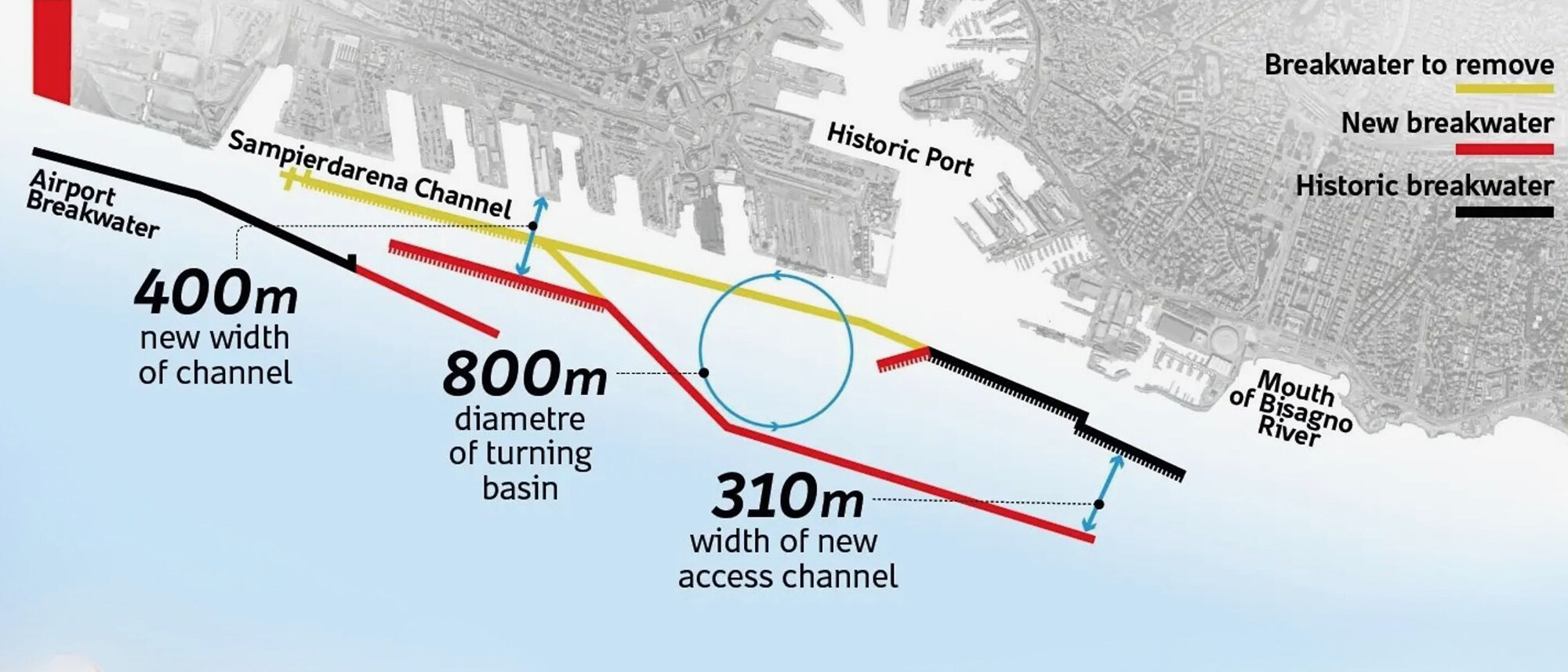 项目核心目标是将港口外部屏障向外延伸450米,形成深度50米的泊位,使超大型集装箱船(最长400米)能在平静水域完成停靠与转弯,预计2027年完成首段4公里工程,2030年全线贯通。扩建后,港区交通量将提升30%,直接带动集装箱运输、港口权及税收收入增长42亿欧元,显著增强热那亚港对欧盟泛欧运输网络莱茵-阿尔卑斯走廊的支撑力。