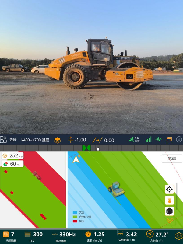 路基智能压实管理系统:实时显示作业道路的振动压实值(VCV)、压实遍数,从而降低传统施工现场测试工具使用的频率,提高一次报检成功率,降低成本开销,提高工作效率。压实数据实时上传至施工管理平台,管理人员可远程监控施工进度和质量,一键生成进度、质量报告。