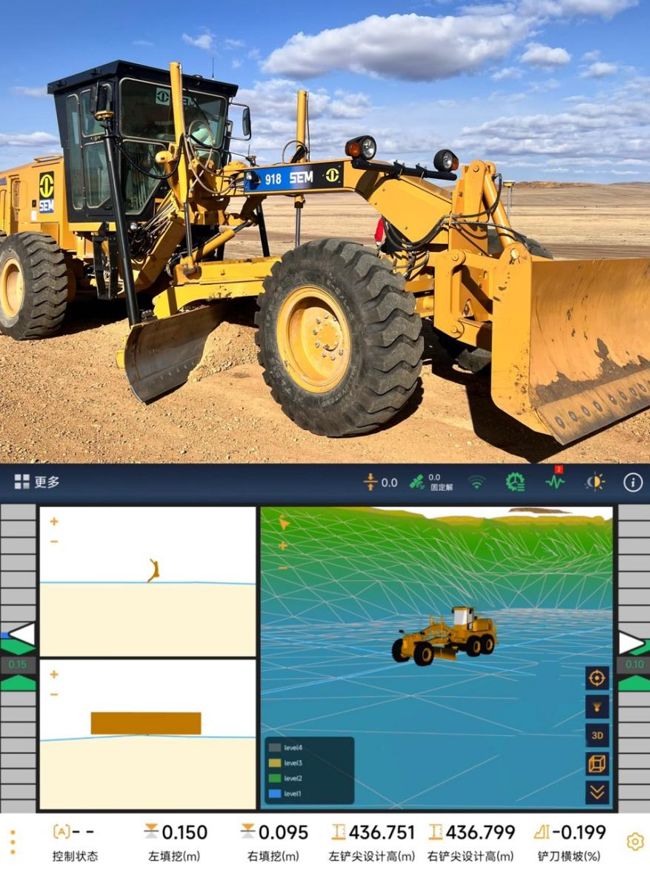 平地机3D自动控制系统:通过GNSS高精度定位定向技术、倾斜传感技术和液压控制技术,实时测量平地机铲刀的三维位置,并根据车载平板电脑上的三维设计文件自动调节铲刀姿态,减少了测量、放样、打桩的时间消耗,提高施工精度、降低人力成本。