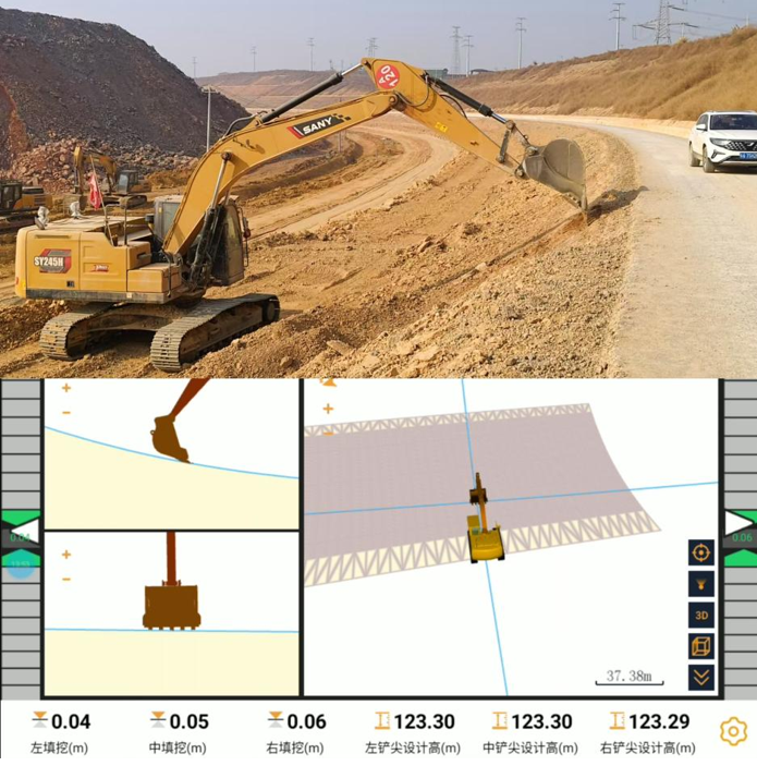 挖掘机3D引导系统:结合高精度定位技术,计算出铲斗斗齿实时、精确的三维位置信息,驾驶员根据车载平板显示的三维图形及填挖值等信息进行作业,使得施工精度达到±3cm以内,界面可实时展示和记录作业完成情况,防止超挖、欠挖。作业更加灵活方便,即使在视觉盲区,也能精确完成工作。