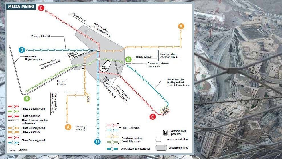 根据披露方案,首期工程将聚焦B、C双线,通过2.4公里隧道连接既有Mashaer朝圣轻轨线,形成62公里运营网络。该线路包含31座车站(含3座地标站),其中19.5公里为地下段、41.2公里为高架段,预计配备66列列车,年运力达1.71亿人次。第二阶段计划2038年投运,通过84.7公里新线将服务范围扩展至麦加市郊,同步启动A、D线核心段建设,新增45座车站与2个车辆段,年客运量预期突破5亿人次。最终阶段将于2045年完成,通过36公里高架延伸线实现全网络贯通,总运力提升至每日120万人次、年6.42亿人次。