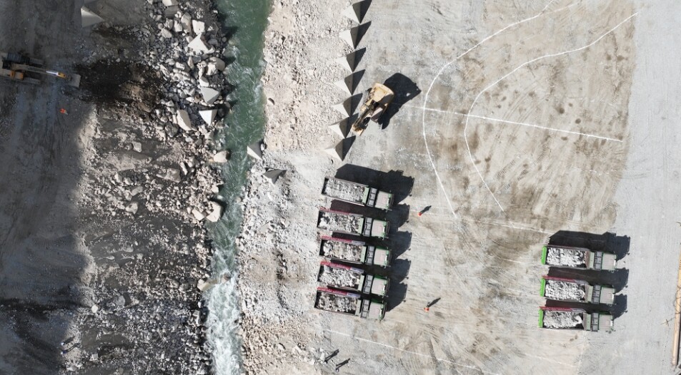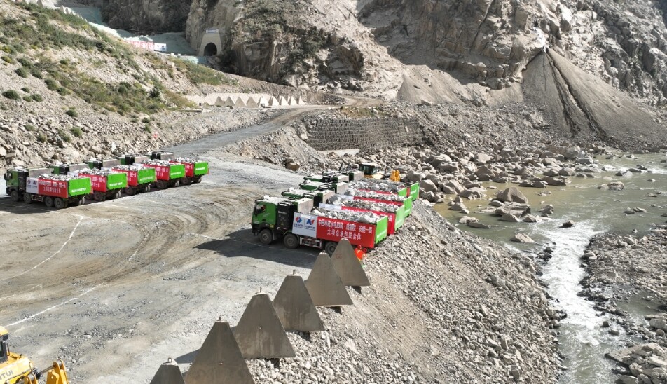 面对截流过程中流量大、流速快的挑战,中国水电四局采用“单戗立堵、从左岸向右岸单向进占”的先进方案,共投入各类施工设备80余台(套)。值得一提的是,为深入践行“双碳”理念,项目管理团队专门配备了20台新能源自卸车,在降低碳排放的同时,也提升了施工效率。