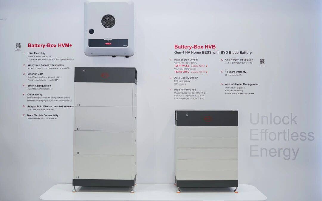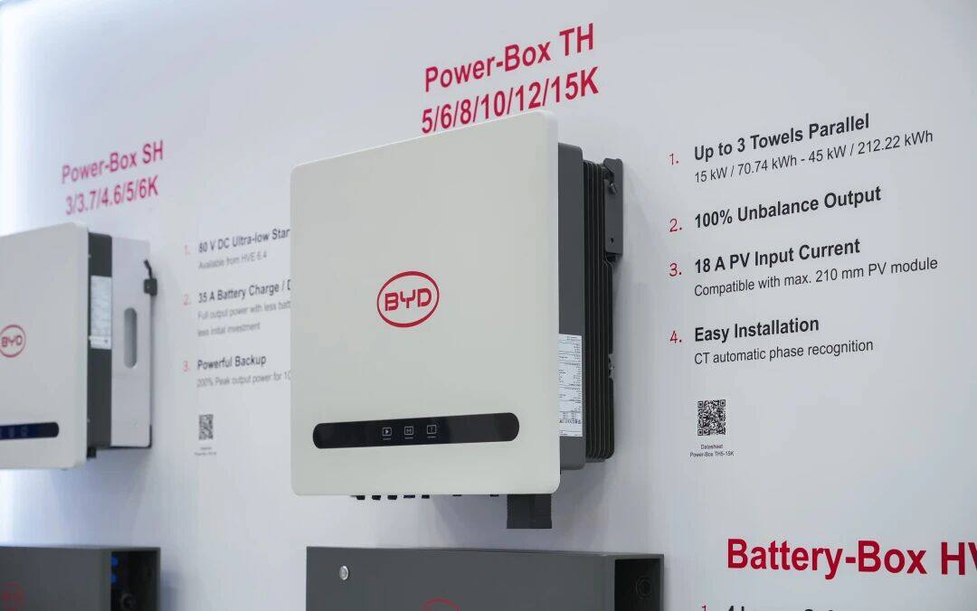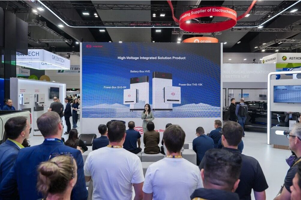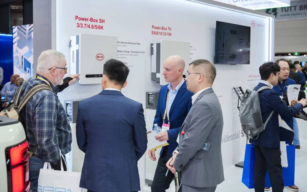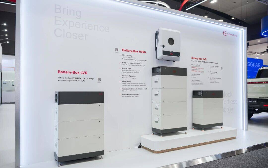 Battery-Box适配澳洲家庭需求 针对澳洲火热的家储市场,比亚迪储能带来Battery-Box和Power-Box系列产品,深度契合澳大利亚“Cheaper Home Batteries”补贴政策要求,可无缝融入澳洲家庭光伏系统,有效降低家庭用电成本。 比亚迪储能在展台现场发布了HVE系统解决方案,该方案包含储能电池Battery-Box HVE,单相高压混合逆变器Power-Box SH3-6K与三相高压混合逆变器Power-Box TH5-15K。其中Battery-Box HVE采用140毫米超薄设计,支持壁挂安装,大幅节省安装空间,适配各类家居环境。产品提供6.43kWh与4.29kWh两种容量模块,可自由组合,最大三塔并联可扩容至70.74kWh。搭配比亚迪品牌逆变器,灵活满足不同家庭的用电与扩容需求。从日常用电优化到应急供电保障,HVE系统解决方案为澳洲家庭提供安全、灵活、长效的户储解决方案,助力家庭能源自主与成本优化。