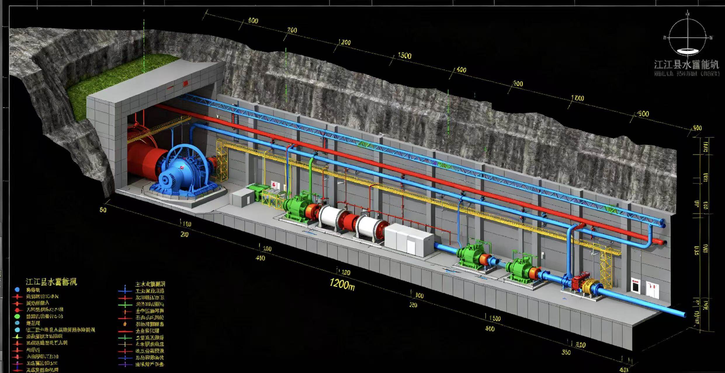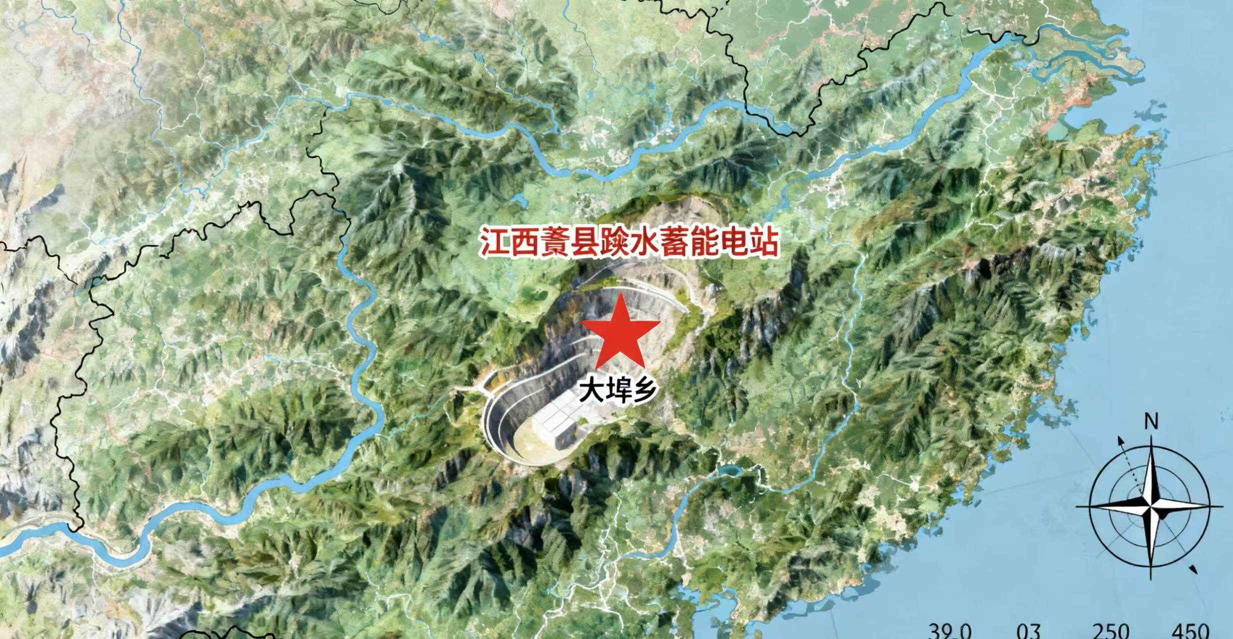赣县抽水蓄能电站地处赣县区大埠乡境内,属一等大型水利能源工程,规划总装机容量120万千瓦,共安装4台单机容量30万千瓦的可逆式水轮发电机组。项目整体由核心枢纽和配套设施两大部分构成:核心枢纽包括上水库、下水库、引水发电系统及地下厂房,其中上水库大坝采用混凝土重力坝设计,最大坝高68米,总库容达1986万立方米,下水库依托天然山谷地形筑坝,与上水库形成362米的天然水位差,为高效发电提供充足势能;地下厂房位于两库之间的山体内部,洞室群总长度超1200米,将集中布置发电机组、主变压器等核心设备,实现能量转换与电力输出。配套设施则涵盖地面开关站、施工便道、供水供电系统及生态保护工程,全方位保障项目建设与运营。