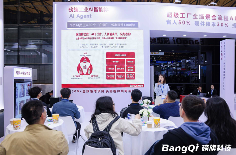此次,磅旗科技融合AI中枢大脑、智能机器人群与智能体平台,系统化展示了其“AI +软件+硬件+服务”一体化战略的落地成果和全面创新实力。