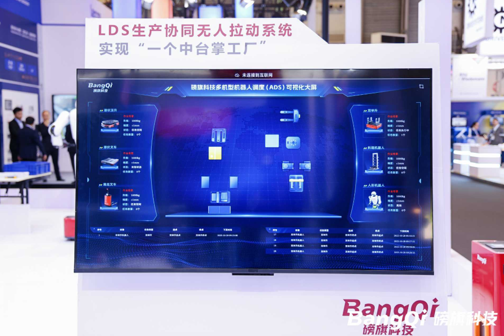 本次CeMAT,磅旗科技以“从无人工厂、无人仓库到无人公司,重构未来智慧物流”为主题,重磅展示“AI+软件+硬件+服务”一体化战略的落地成果,涵盖具身机器人、工业 AI 智能体、AI工业操作系统LDS+多品牌机器人混合调度系统ADS以及创新RaaS(机器人即服务)模式等,吸引大量中外专业观众驻足咨询。