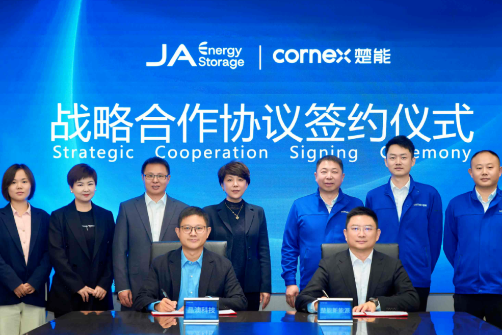 11月6日,楚能新能源与晶澳科技在楚能全球总部正式签署战略合作协议。楚能新能源总裁黄锋、副总裁郑鹏,晶澳科技董事靳军辉、储能事业部总裁金斌、副总裁付海明等双方高层代表共同出席,并就深化合作、共拓全球市场等议题展开深入交流。