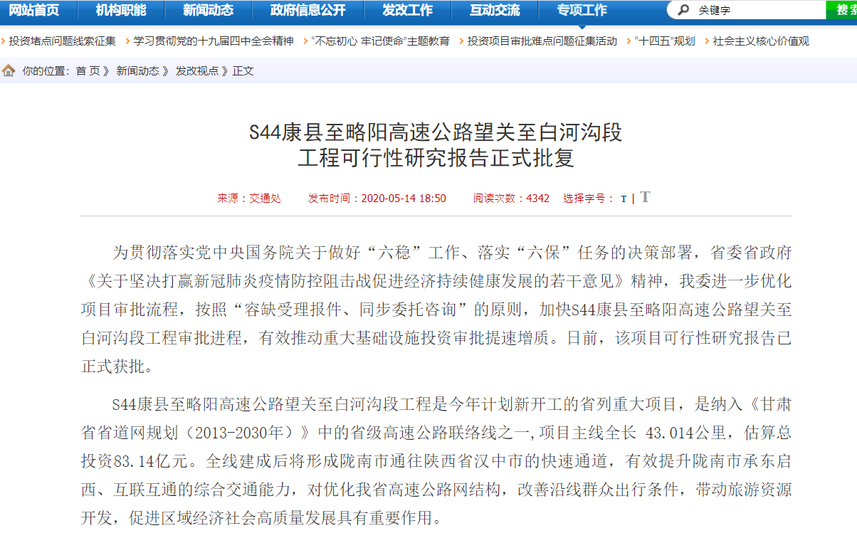 2020年5月14日,甘肃省发改委官网发布,正式批复了康县至略阳高速公路望关至白河沟段工程可行性研究报告。