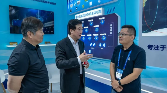 展会期间,中国高科技产业化研究会党委书记、理事长梁小虹等一行专程莅临展位,苍宇天基高级副总裁兼深圳公司总经理沈世军围绕苍宇星座轨道覆盖范围、天基信息系统总体框架及行业应用前景与其展开交流。梁小虹书记对苍宇天基的市场解决方案与商业化价值给予高度认可,认为苍宇天基将填补相关领域市场空白,为航天产业与战略性新兴产业融合提供重要支撑。