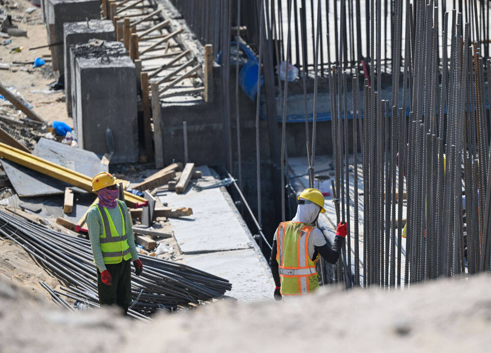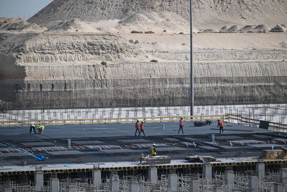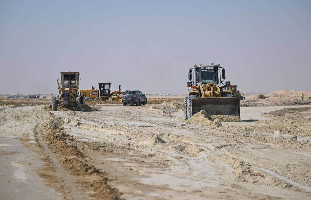 2025年11月1日,在科威特杰赫拉省,工人在南萨阿德阿卜杜拉新城基础设施项目施工现场工作。