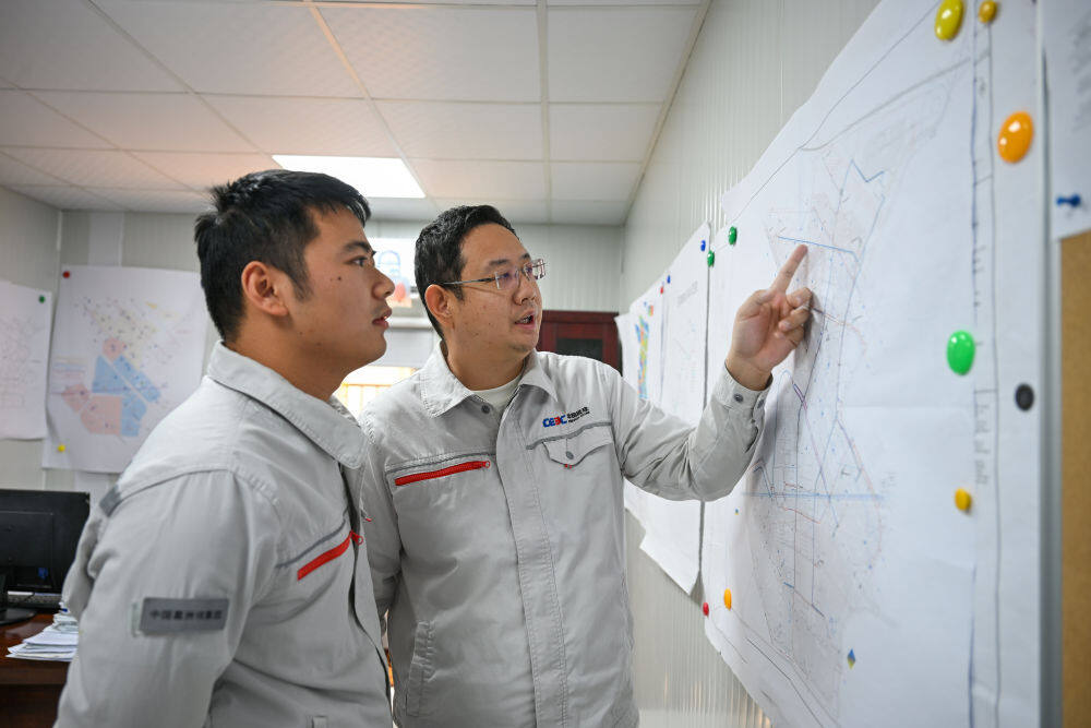 2025年9月9日,在科威特阿卜杜拉新城项目地,中国能建葛洲坝集团员工在查看项目规划图。