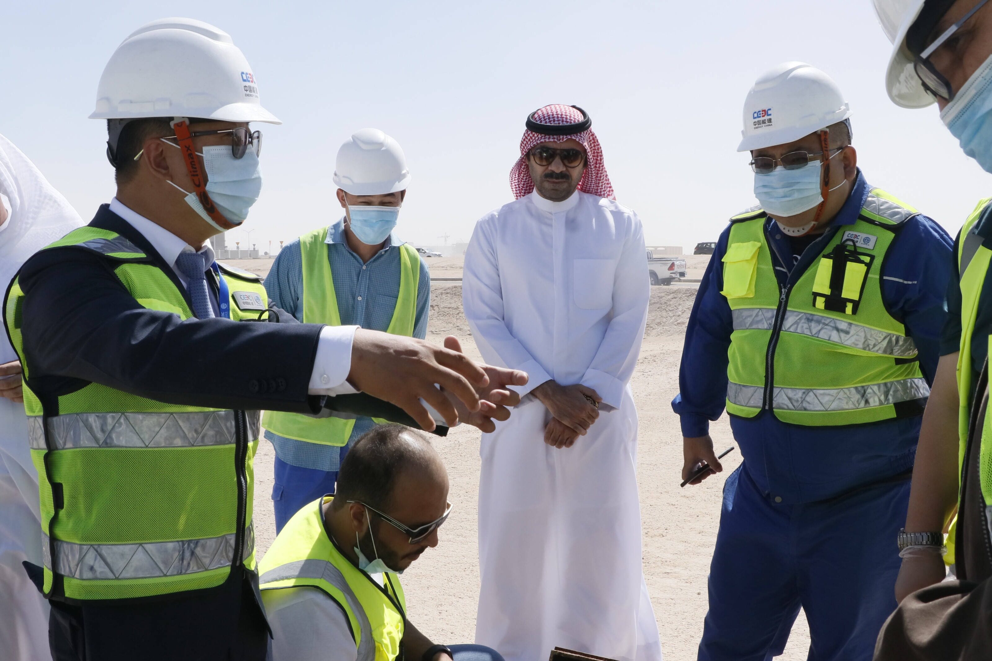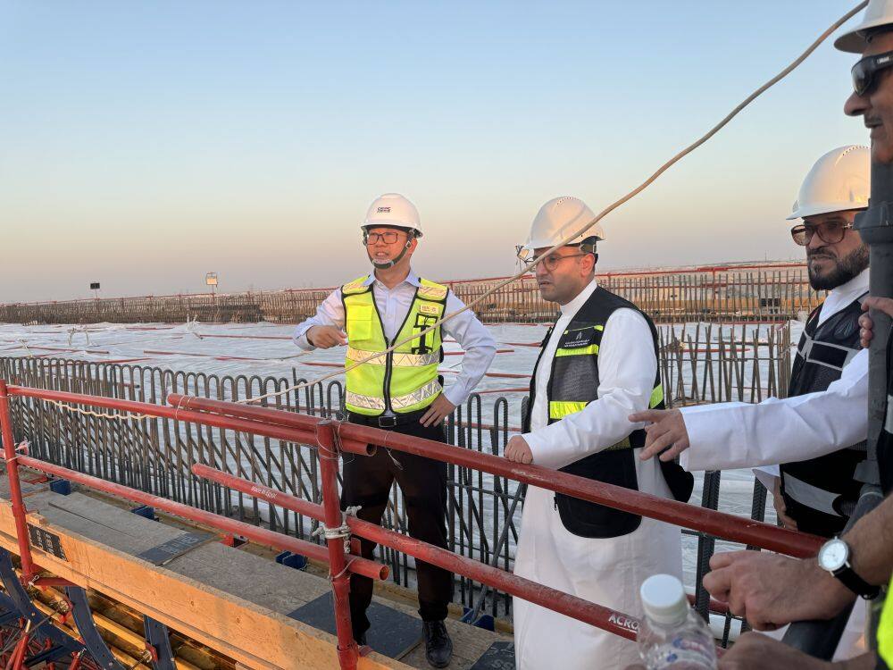 2024年9月29日,何柏森(左一)在科威特阿卜杜拉新城项目地向到访项目现场的科威特政府官员介绍工程情况。