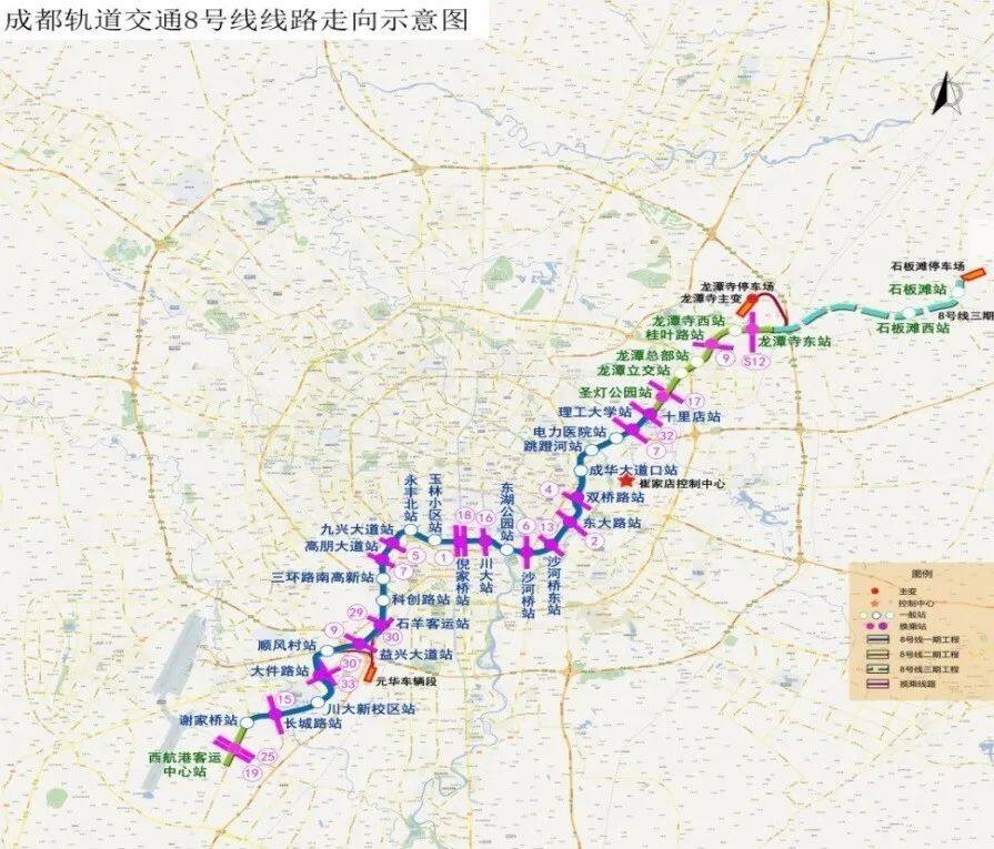 成都轨道交通8号线总体呈西南~东北走向,8号线二期工程作为一期工程的延伸线,共分两段线路;其中西南延伸段(西航港客运中心站~莲花站<不含>,沿西航港大道敷设)共设1站1区间,线路长1.25km;东北延伸段(十里店站<不含>~龙潭寺东站,沿成华大道~规划路敷设)共设6站6区间,线路长6.56km。8号线二期工程线路全长7.81km,均为地下线,共设置车站7座,其中换乘站3座,平均站间距为1.12km,最高运行速度80km/h。
