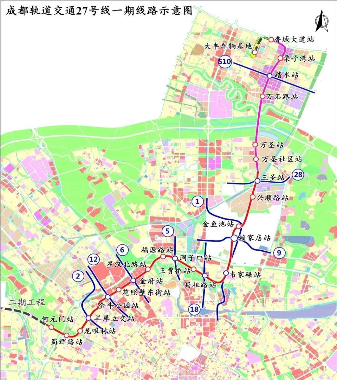 成都轨道交通27号线一期工程北起新都区香城大道站,西至青羊区何元门站,主要沿香城大道、万石路、中环大道、金府路、育苗路、同怡路、蜀江路敷设。线路全长24.86km(高架线约7.52km,地下线17.34km),共设置车站23座,其中换乘站9座,平均站间距为1.10km,最高运行速度80km/h。设大丰车辆基地1座,设大丰和韦家碾2座主所,控制中心共享线网新苗控制中心。