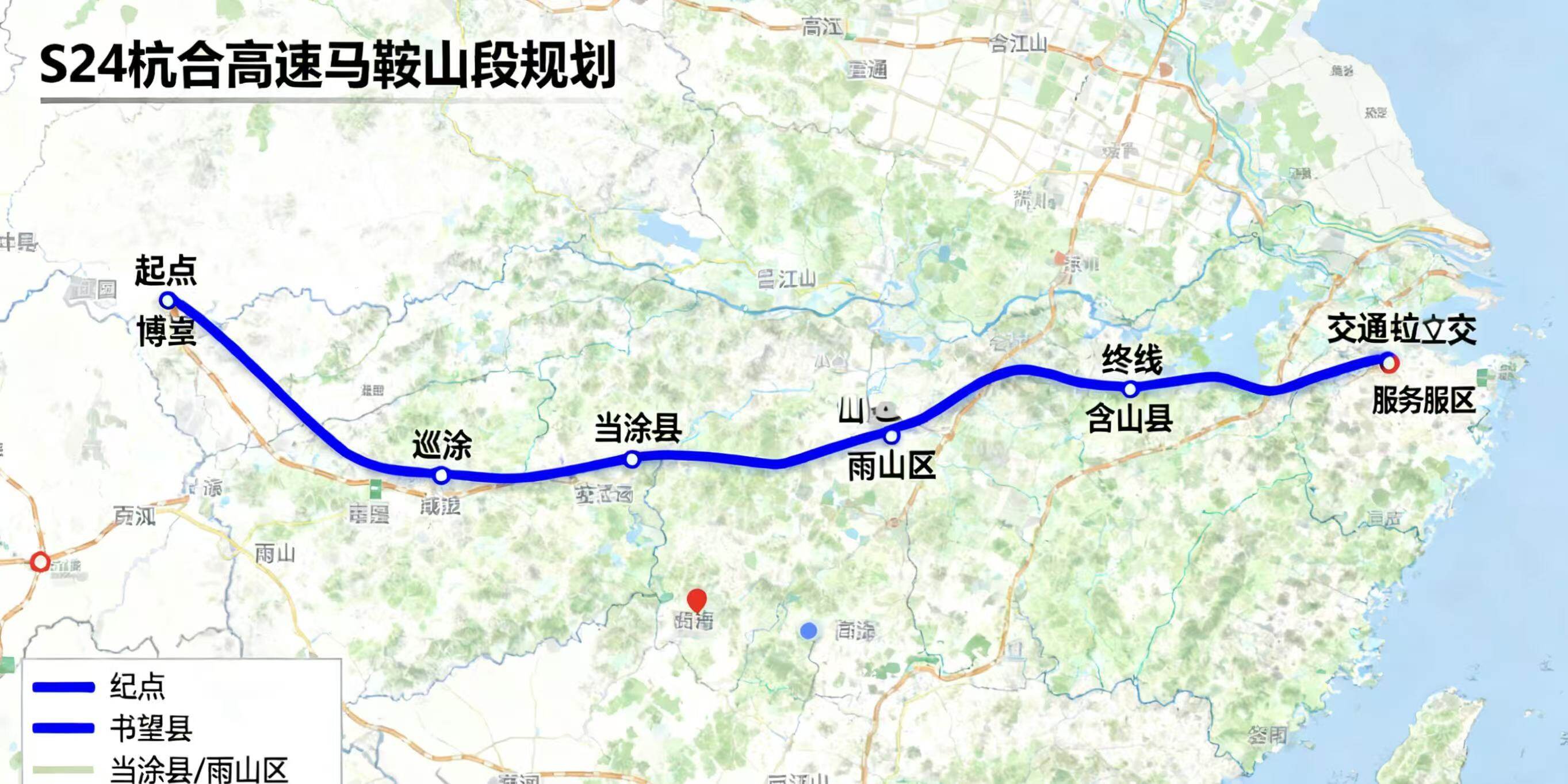 作为长三角一体化发展规划中的重点省际通道,S24杭合高速马鞍山段的选址与建设兼具战略意义与实用价值。项目起于马鞍山市博望区丹阳镇(接江苏段已建高速),向西途经当涂县、雨山区,终至含山县林头镇(衔接合巢芜高速),路线全长约65公里,采用双向六车道高速公路标准建设,设计时速120公里。全线规划设置互通立交8处(其中枢纽互通3处)、服务区2处、养护工区1处,同步建设连接线约10公里,实现与马鞍山市域路网及长三角高速网络的无缝衔接,进一步完善“杭州—马鞍山—合肥”的快速交通走廊。