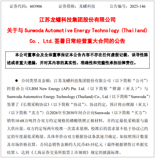 12月2日,龙蟠科技发布公告,其控股孙公司锂源与欣旺达汽车电池有限公司签署了《长期采购协议》。根据协议,自2026年至2030年,龙蟠科技预计将向后者销售共计10.68万吨磷酸铁锂正极材料,合同总销售金额预计在45亿至55亿元之间。这不仅为龙蟠科技带来了长期稳定的业绩预期,更揭示了中国电池产业链上下游在海外协同布局的新模式。