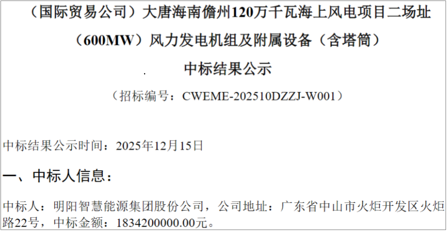 在海南儋州西北部海域,离岸约34公里的蔚蓝海面上,一场清洁能源革命正在悄然上演。2025年12月15日,中国大唐电子商务平台发布的一则中标公告,让这片海域再次成为业界关注的焦点。明阳智能成功斩获大唐海南儋州120万千瓦海上风电项目二场址(600MW)风力发电机组及附属设备大单,中标价格高达18.342亿元,标志着中国海上风电产业又迈出了坚实的一步。
