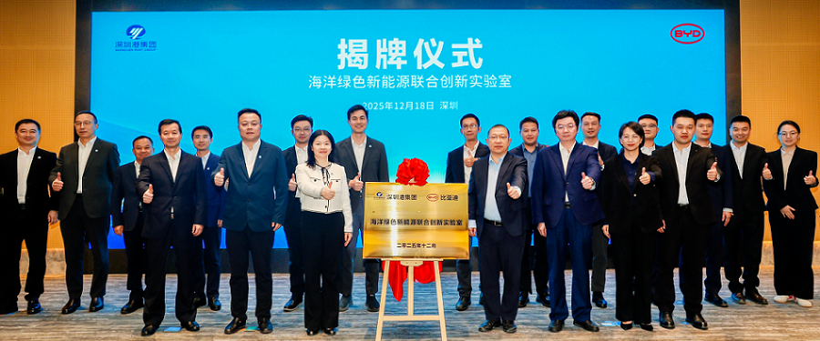 2025年12月18日,比亚迪与深圳港集团有限公司共建的海洋绿色新能源联合创新实验室正式揭牌。深圳坪山区政府常务副区长袁虎勇、发改局局长黄堃、深圳港集团董事长胡朝阳、比亚迪集团执行副总裁兼电池事业群CEO何龙见证揭牌仪式。深圳港集团总裁沈华新、副总裁王彦,比亚迪储能及新型电池事业部总经理尹雪芹、新型电池产品线总监江钰锋等出席活动。