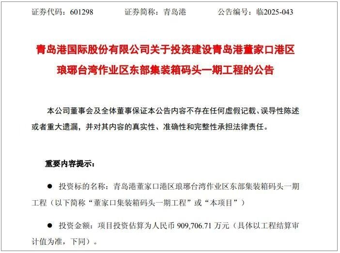 青岛港(601298)于2025年12月19日发布一纸公告引发行业瞩目:拟斥资157亿元,在董家口港区同步推进两大重量级码头工程,分别为90.97亿元的琅琊台湾作业区东部集装箱码头一期工程,以及66.15亿元的湾底通用码头工程。两大项目均计划4年建设、2029年建成投产,建成后将大幅提升青岛港集装箱与散杂货吞吐能力,为其一湾两翼辖六区发展格局再添核心支点,更将为黄河流域高质量发展与山东港口一体化改革注入澎湃动能。