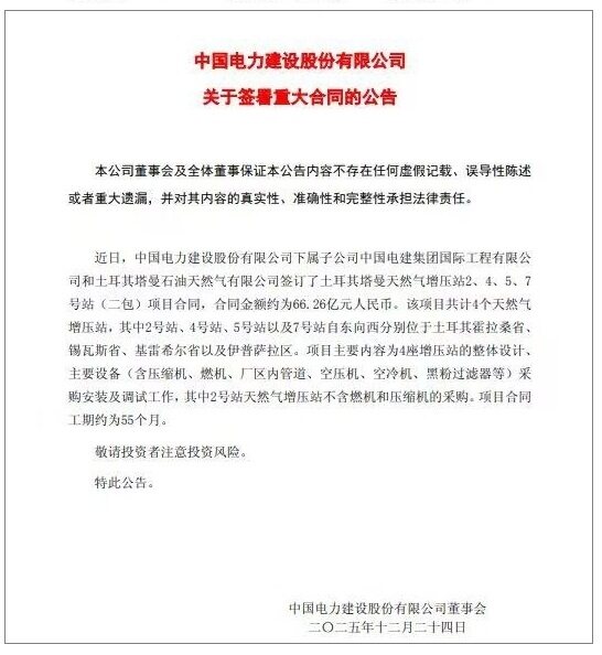 当土耳其广袤的土地上,一条条天然气管道正静待着动力升级的契机,一家来自中国的基建巨头,正以一笔重磅订单,为当地能源管网的高效运转注入新动能。2025年12月24日,中国电建(601669)发布重大合同公告,旗下子公司中国电建集团国际工程有限公司与土耳其塔曼石油天然气有限公司正式签约,将承建土耳其塔曼天然气增压站2、4、5、7号站二包项目,合同金额高达66.26亿元人民币,这也成为中国电建在西亚能源基建领域的又一标志性成果。
