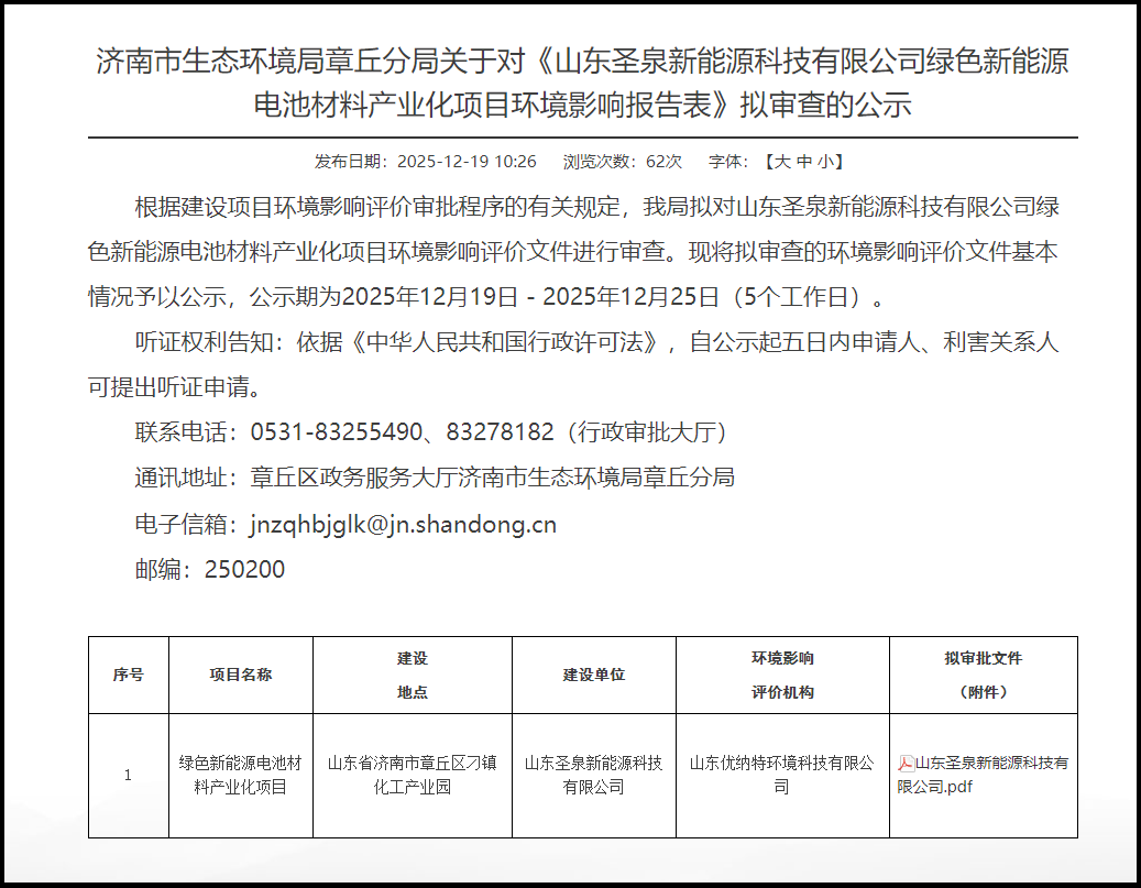 济南市生态环境局章丘分局最新公示显示,山东圣泉新能源科技有限公司的新能源电池材料产业化项目已正式获批落地。该项目的实施将推动山东在高端电池材料领域形成新的产业优势。