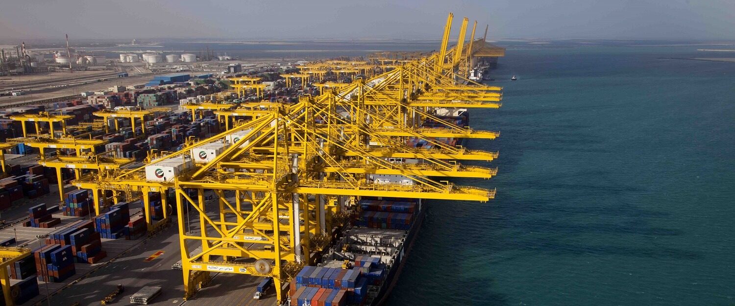 一艘巨轮缓缓停靠在杰贝阿里港,甲板上满载的集装箱仿佛一座移动的现代城堡,这艘船从新加坡来,将在这里卸下一部分货物,再装载发往欧洲的商品——这样的场景每时每刻都在迪拜海岸上演。