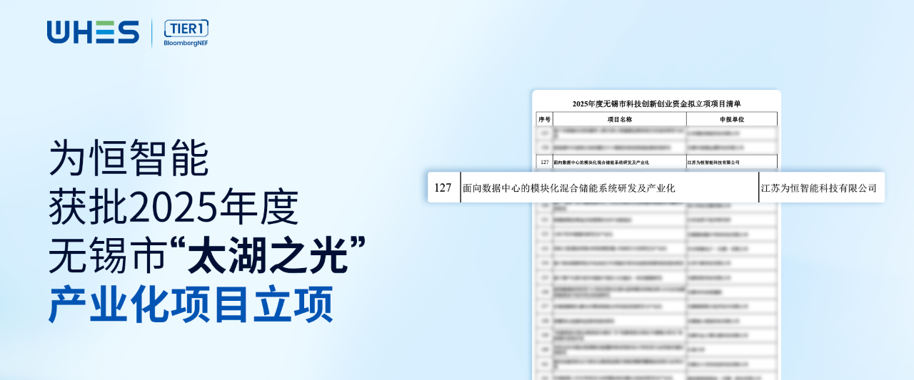 近日,2025年度无锡市科技创新创业资金“太湖之光”科技攻关计划(产业化关键技术攻关)项目清单正式公示。为恒智能申报的“面向数据中心的模块化混合储能系统研发及产业化”项目成功入选,并获得无锡市科技创新创业资金支持。