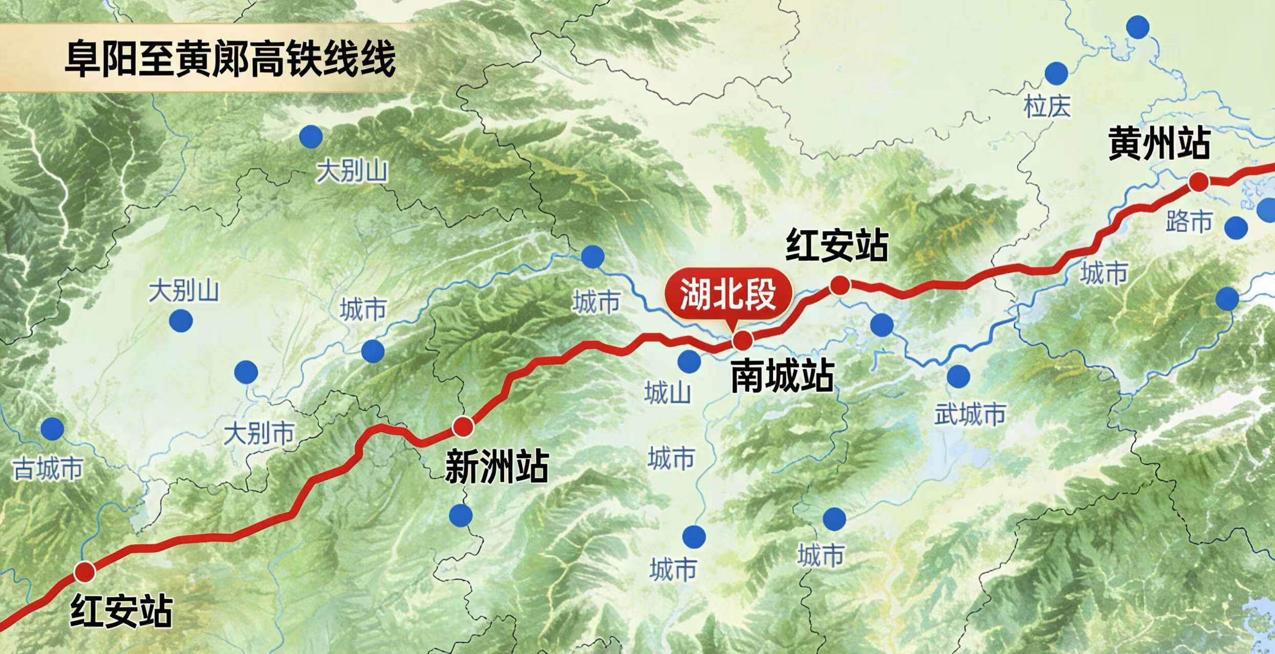 阜黄高铁北起安徽阜阳,经河南信阳,南入湖北红安、麻城、新洲,终至黄冈,湖北段全长131公里、投资231.1亿元,按350公里/小时标准建设。全线新建桥梁66.7公里、隧道10.5公里,设新洲东、红安东、麻城西、黄州4座车站,其中麻城西等3站预留6线规模,为未来线路延伸预留空间。两条联络线同步规划,麻城西联络线(160公里/小时)衔接既有路网,黄梅南联络线(250公里/小时)打通南下通道。