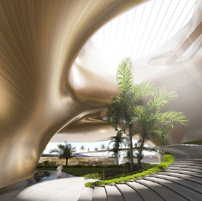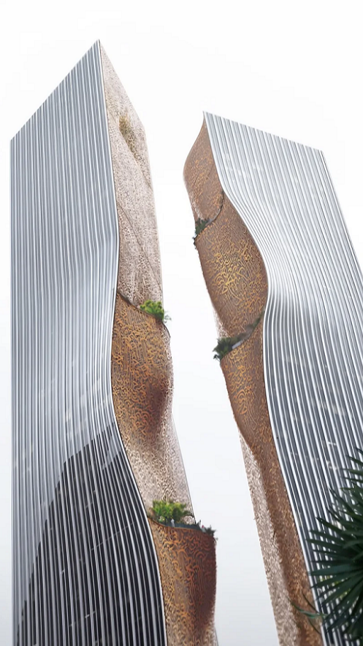 在设计理念上,方案立足全球视野,深度回应地域文脉与气候特征。双子塔以“垂直沙丘”之势向天际生长,象征城市发展的力量与精神高度;裙楼则化为“水平沙丘”,柔性铺展于城市界面之上,塑造兼具遮荫、通风与公共活力的立体城市客厅。塔楼顶部的空中生态花园,将自然引入高密度城市核心,构建面向未来的可持续生活图景。项目在形式与精神层面汲取贝都因文明与伊斯兰文化的深层意象,以圣洁的色彩、流动的曲线与富有张力的空间节奏,营造克制而庄重的建筑诗性表达。双塔相互呼应、彼此守望,象征信念、秩序与情感的共生,成为根植于利雅得土地之上的当代城市艺术地标。