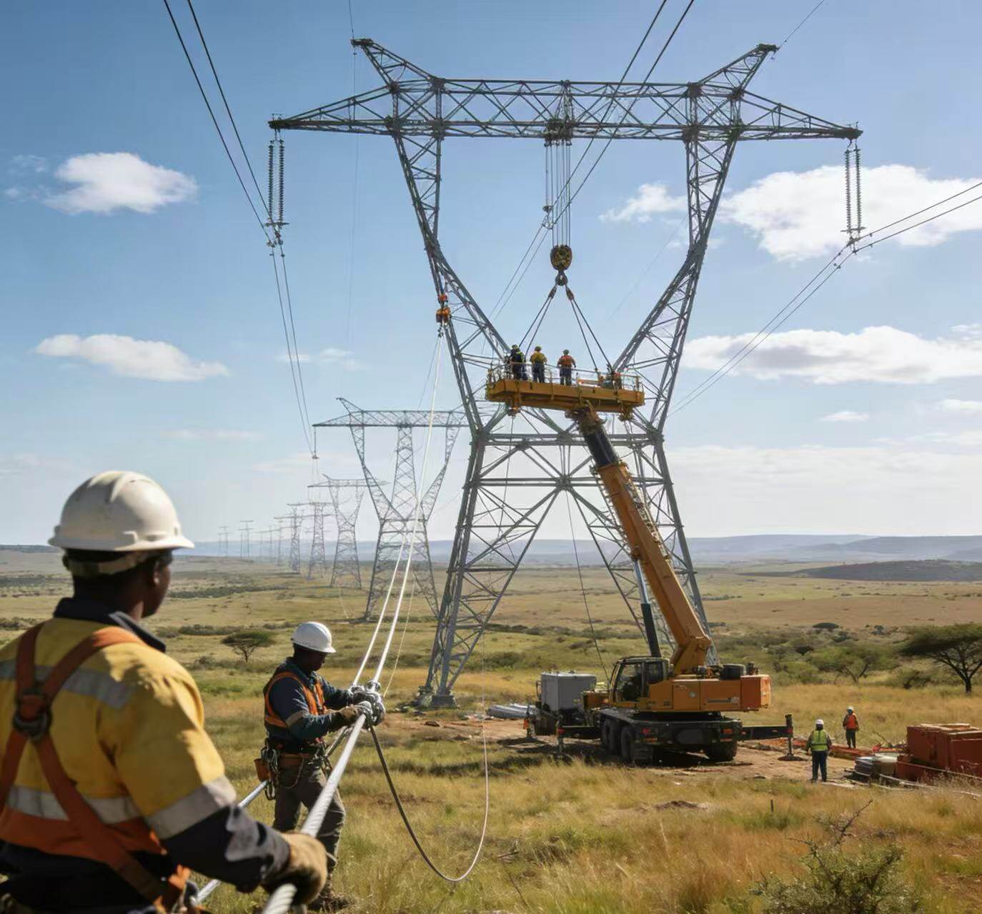 梅杜皮-威特科普400千伏输电线路是南非北部核心输电走廊的关键工程,承担着将梅杜皮电站电力接入全国电网的重任。项目涵盖约200公里输电线路建设及配套设施升级,核心目标是保障梅杜皮电站满负荷运行时的电力稳定输送。截至2025年12月,项目整体完工率已达98%,仅剩小段导线拉紧作业与最终电气测试工作待完成。此前,项目曾因局部路径土地征用问题出现工期延误,随着这一问题的解决,工程即将进入投运倒计时。项目建成后,不仅能提升区域电网稳定性,支撑新增电源并网,更将有效化解局部输电瓶颈引发的电力削减风险,为南非电力供应提供坚实保障。