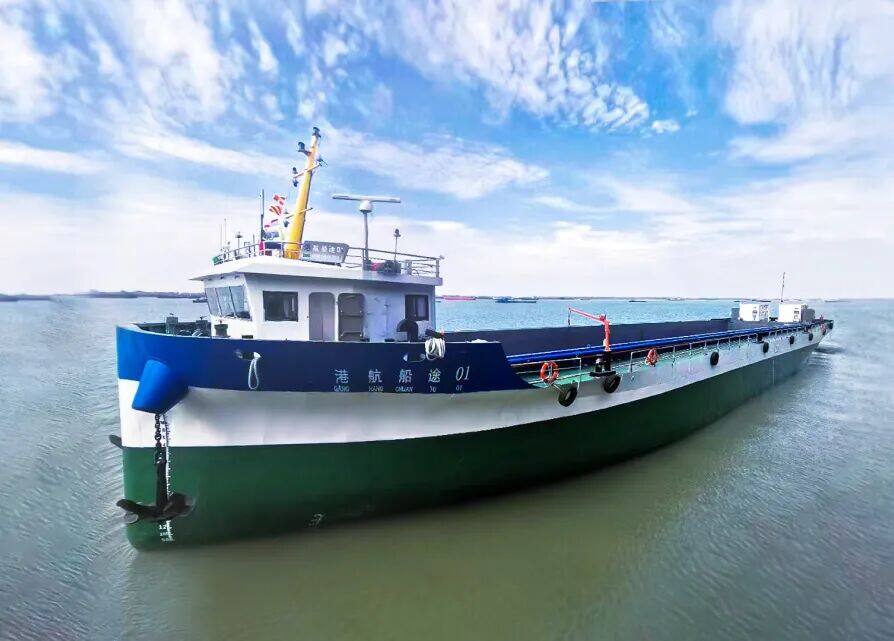 该船船长109.80米,型宽26.80米,型深7.20米,载重量约9000吨,航速11.5节,采用电油混合驱动技术,配备8组集装箱式移动电源(单箱电池容量1999.9kWh)及2台柴油发电机组。在纯燃油模式下,续航可达4000海里;纯电模式下,续航约为180海里。