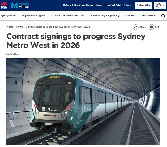 2026年1月5日,港铁公司正式宣布,其与中国中车子公司组成的联营公司Metro Trains West,成功中标澳大利亚新南威尔士州悉尼地铁西线项目的“列车、系统、营运及维修”核心合约,合同总价值约39.6亿澳元。根据合约,联营公司将负责提供16列新一代全自动无人驾驶地铁列车及相关系统,并承担系统整合、测试调试以及通车后长达15年的运营与维修服务。