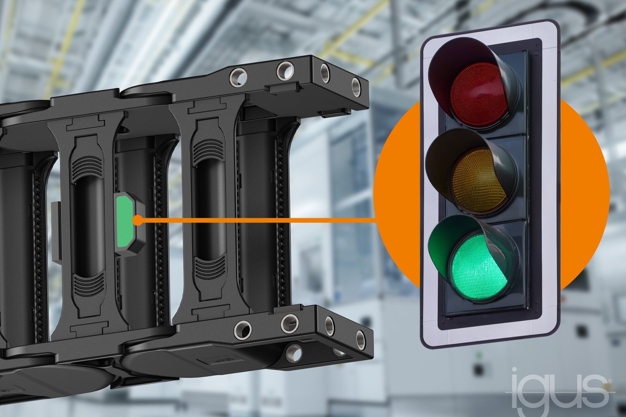 借助新型 EC.WLC 指示器 ,igus 为其 E4Q 系列滑行拖链的状态监测提供了一种简便的解决方案。该产品的特别之处在于,它完全无需电子元件、软件或外部电源即可工作。这种机械传感器采用基于交通信号灯的颜色标识,直接在传感器上显示磨损状态,使维护工作变得可规划、透明且极具成本效益。