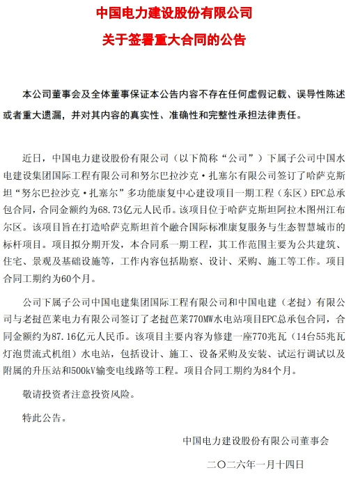中国电建于1月13日发布公告,宣布其子公司一日之内在哈萨克斯坦与老挝连下两城,成功签署两份重大EPC总承包合同,总金额合计约155.89亿元人民币,再次彰显了其在全球基础设施建设领域的领军地位。