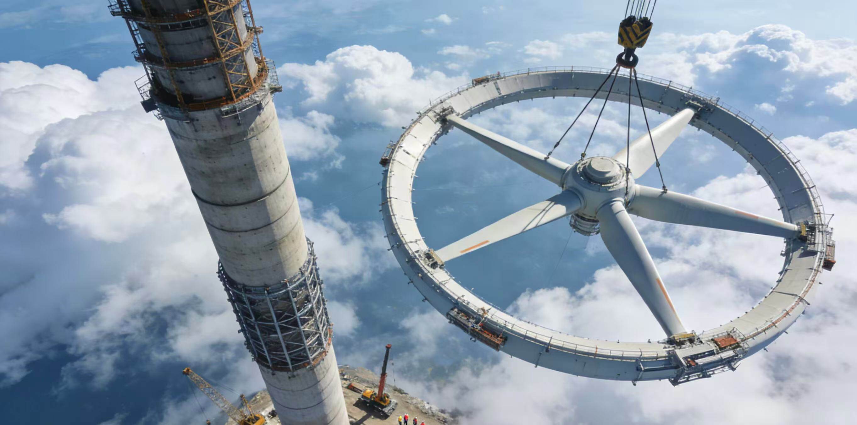 高空俯瞰施工现场,百米混凝土+钢混合塔筒拔地而起,直径230米的巨大叶轮精准完成“云端安装”,一幅清洁能源工程的壮阔图景徐徐展开。