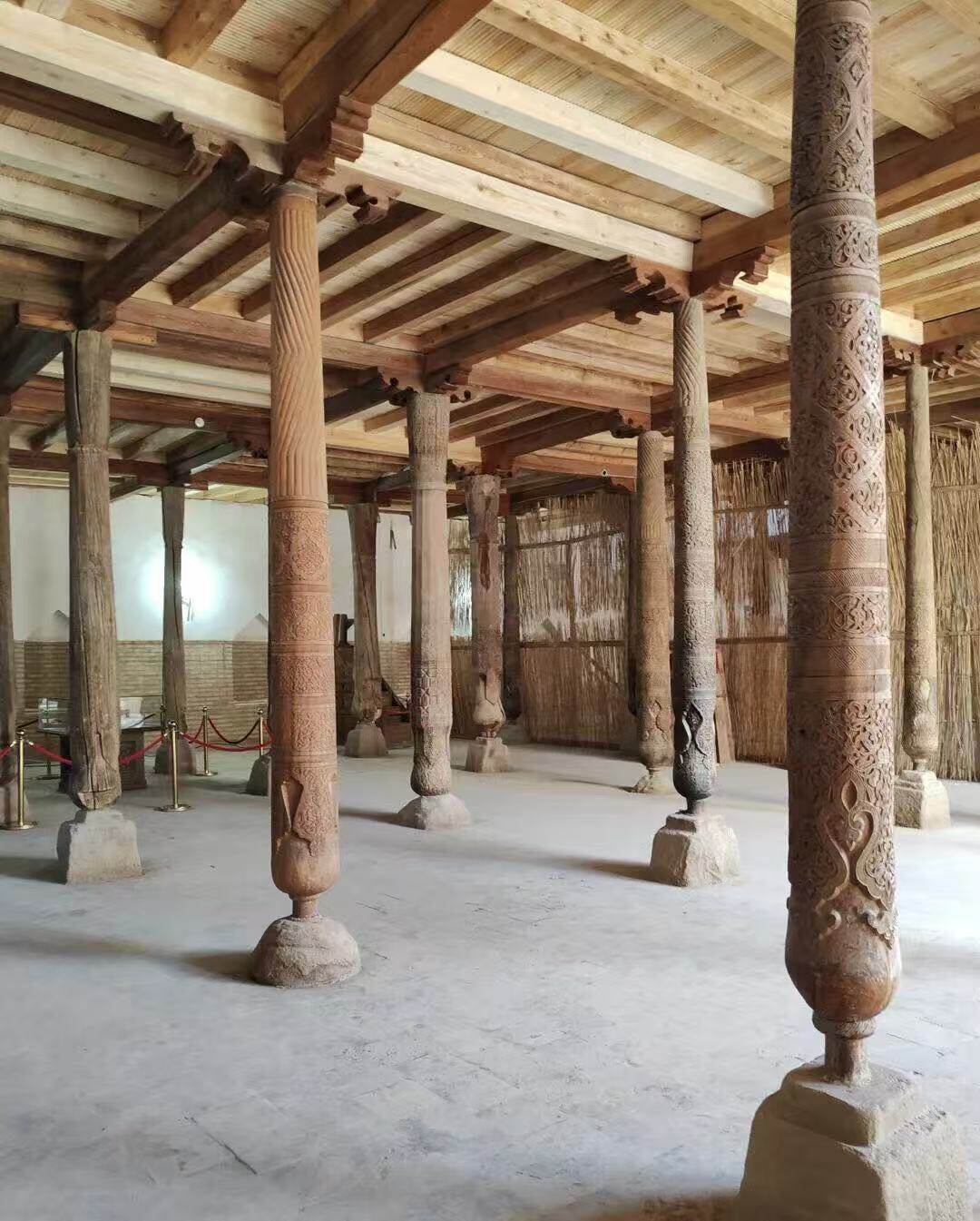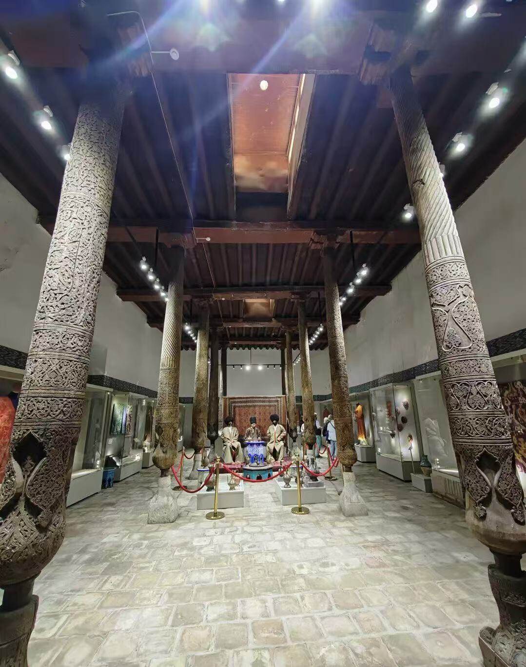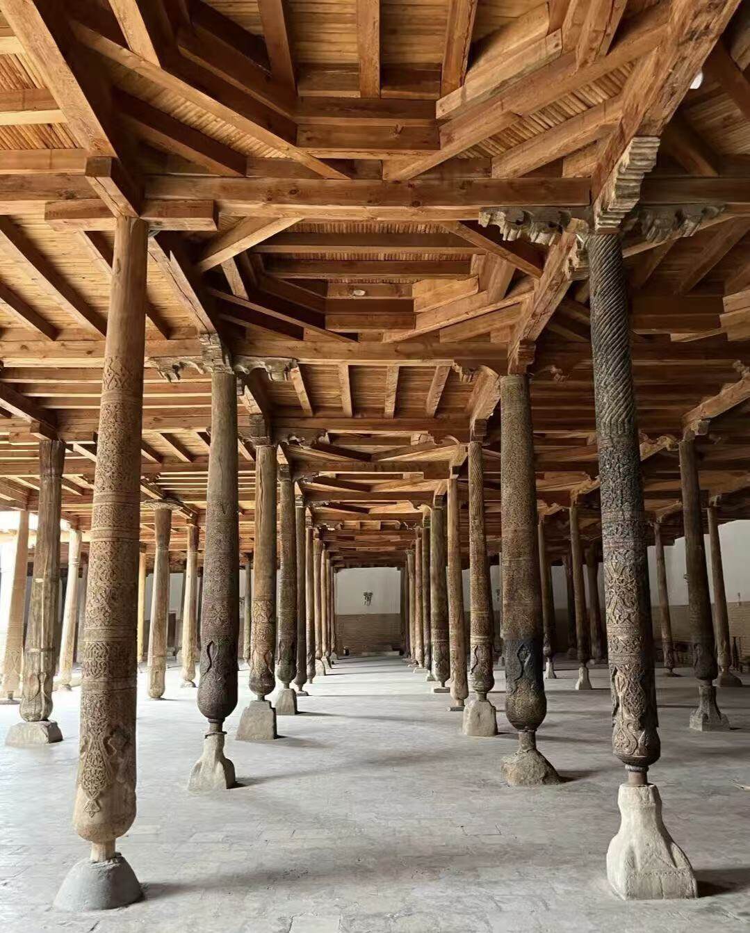 以218根木柱支撑的礼拜大厅著称,柱子雕刻工艺精湛,体现了中亚木雕艺术的巅峰。