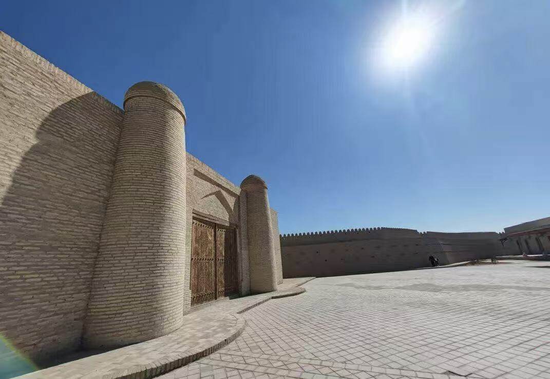 其城墙由生土、黏土和砖坯筑成,现存长度约2.5公里,苏联时期曾经大规模修复过。
