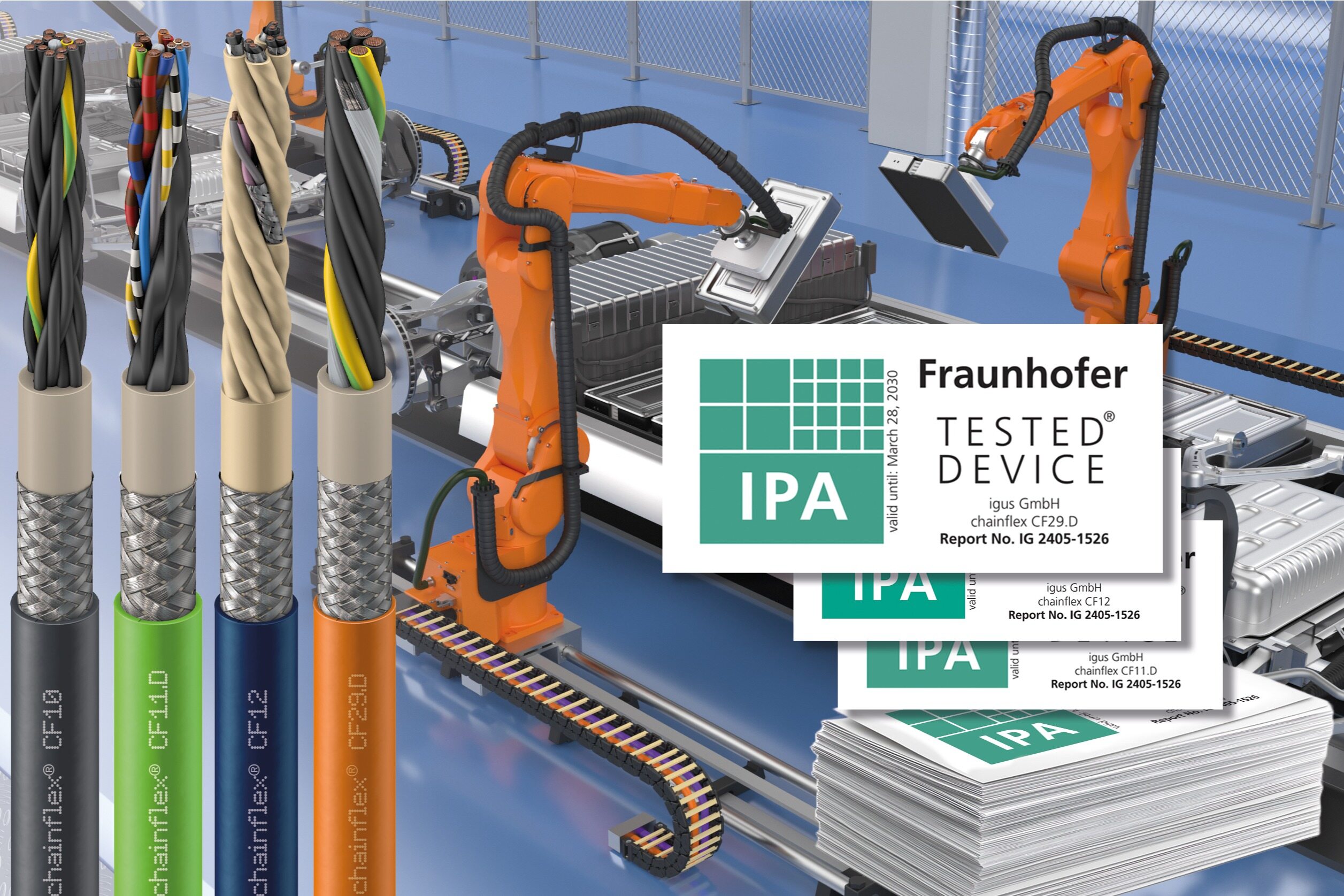 全球范围内,干燥无尘室的数量正不断增加。当前的重点主要在于推动系统自动化,以确保生产快速高效且具有成本效益。除已获干燥无尘室适用认证的拖链产品外,igus如今又成功让旗下无卤chainflex TPE电缆也成功通过了弗劳恩霍夫IPA研究所依据干燥无尘室4级和5级标准开展的认证。这为高度自动化的电池生产领域的客户提供了具备可靠保障的能源管理解决方案,这些方案的使用寿命最长可达四年。