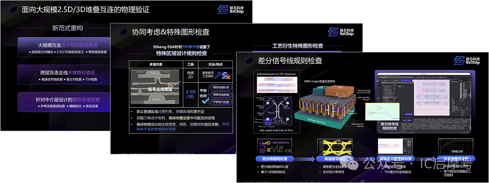 本次硅芯EDA在物理验证工具和方案的发布,也是在堆叠芯片设计范式上创新实践之一。从传统IC内DRC/LVS升维到了跨IC-中介层-基板级的规则和一致性验证:工具支持大规模互连的设计规则自动生成、跨层互连走线关键路径的左移验证、针对中介层设计的复杂互连检查验证,以及机器学习聚类强化的连接走线的自动检查。从二维的DRC升维到了跨芯粒和封装间,从传统的版图原理图一致性验证增维到了物理连接完整性的检查。并且预告在后续会持续推出在架构设计-物理仿真协同-物理验证连续工具和方案的迭代路径。
