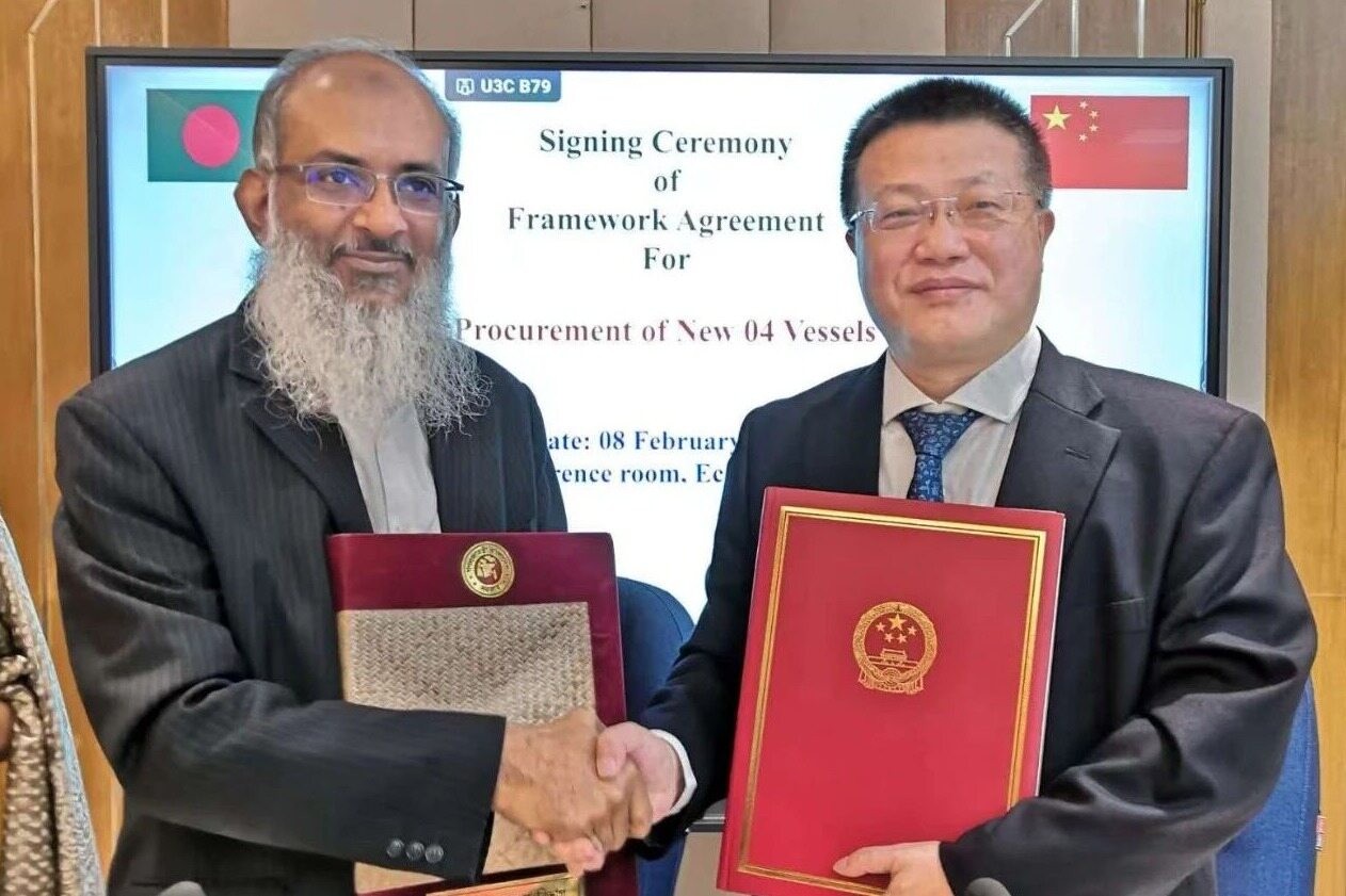 2026年2月8日,姚文大使出席船舶采购项目政府间框架协议签约仪式,代表中国政府与孟财政部经济关系局常秘西迪基共同签署协议。