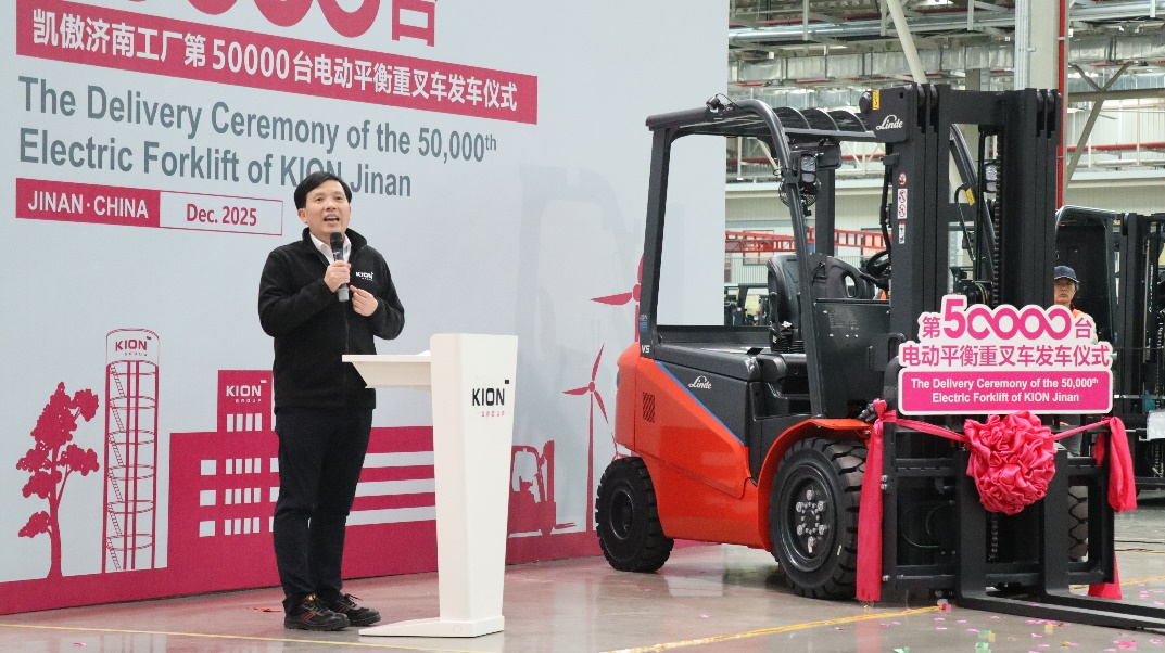 2025年12月,凯傲济南工厂迎来发展历程中的重要里程碑——第50000台叉车成功发车。凯傲集团董事、首席技术官、ITS亚太区总裁郭进鹏先生、凯傲亚太运营副总裁、凯傲济南总经理谢家华先生、凯傲ITS亚太研发及模块开发副总裁许乃江先生、凯傲亚太采购副总裁龚宏彬先生与优秀合作伙伴代表,以及凯傲济南团队共同见证了这一历史性时刻。