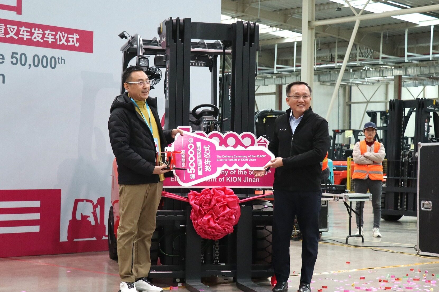 发车仪式现场气氛热烈,郭总与合作伙伴代表共同为济南工厂第50000台电动平衡重叉车揭彩。这不仅是凯傲济南智造实力的证明,更是凯傲硬核产品质量与忠实客户关系的体现。