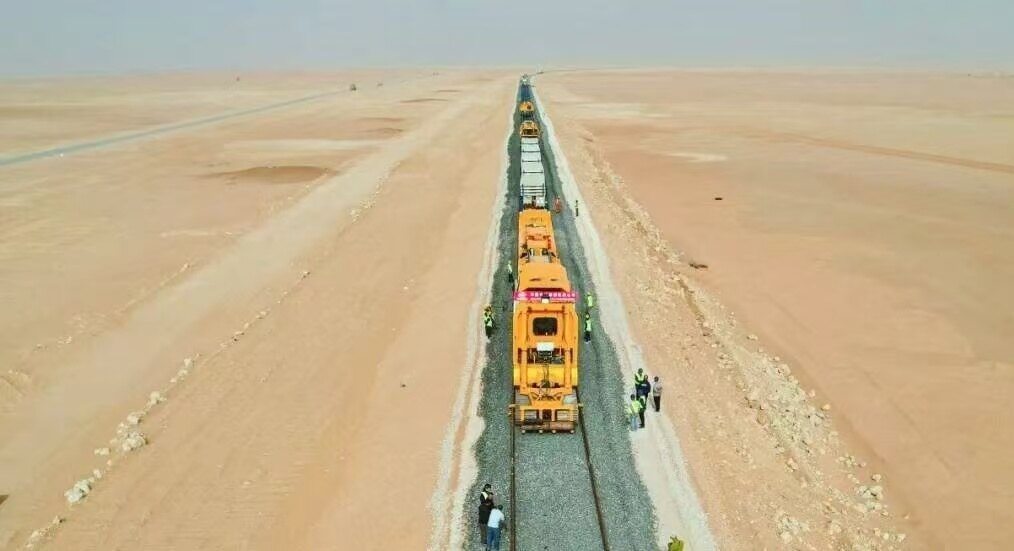 针对风沙危害,项目引入中国成熟治沙技术,采用草方格沙障+高立式沙障+阻沙栅栏体系,固定流沙、保护线路,形成长效防护。为适应极端温差,团队采用定制耐高温特种钢轨与弹性扣件系统,保障轨道几何尺寸稳定;施工装备全面升级散热与防沙密封,确保高温环境连续作业。依托北斗高精度定位与3D激光扫描技术,实现厘米级测控,在无参照物沙海中精准定线,单日最高铺轨焊接4.5公里,刷新当地纪录。