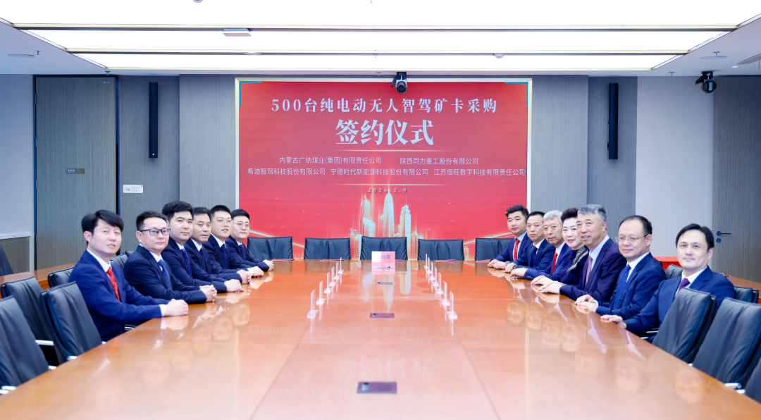 2026年2月9日,内蒙古广纳煤业(集团)有限责任公司、陕西同力重工股份有限公司、希迪智驾科技股份有限公司、宁德时代新能源科技股份有限公司、江苏恒旺数字科技有限责任公司五方在内蒙古乌海举行了500 台纯电动无人智驾矿卡采购签约仪式。此次里程碑式合作,标志着矿山运输行业正式迈入电动无人驾驶技术大规模商业化应用新阶段,为矿业绿色转型与智能化升级树立全新标杆。
