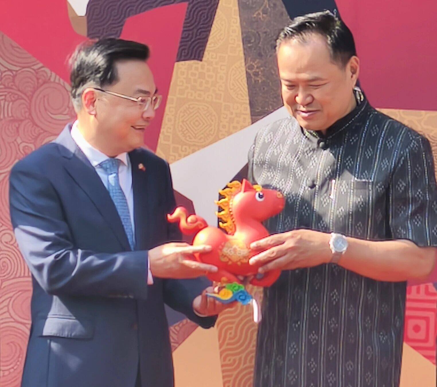 张大使表示,春节是中泰人民的共同节日,深受泰各界喜爱。张大使向阿努廷总理赠送“吉祥马”,阿努廷总理用中文祝福龙马精神、马到成功,欢迎更多中国游客来泰旅游。