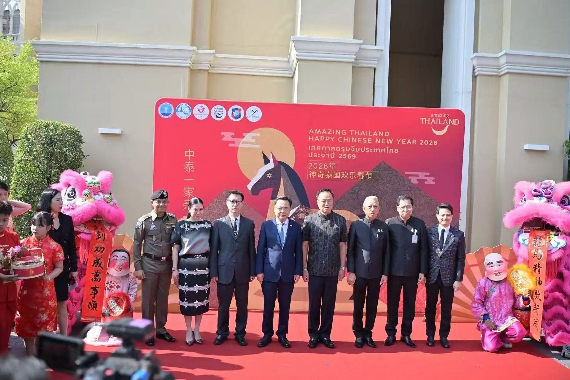 总理府专设了马年“欢乐春节”主题背景板,泰国当地舞狮助兴,中泰媒体现场拍摄报道,院内喜气洋洋、年味浓郁。