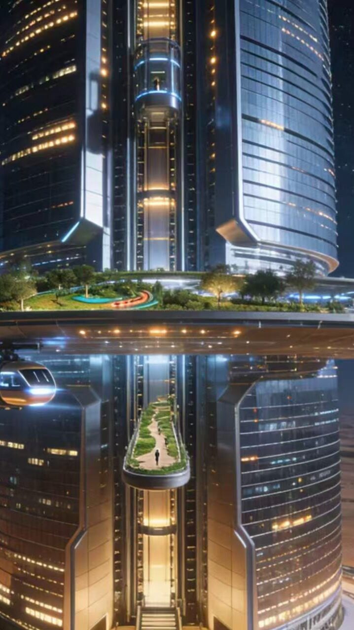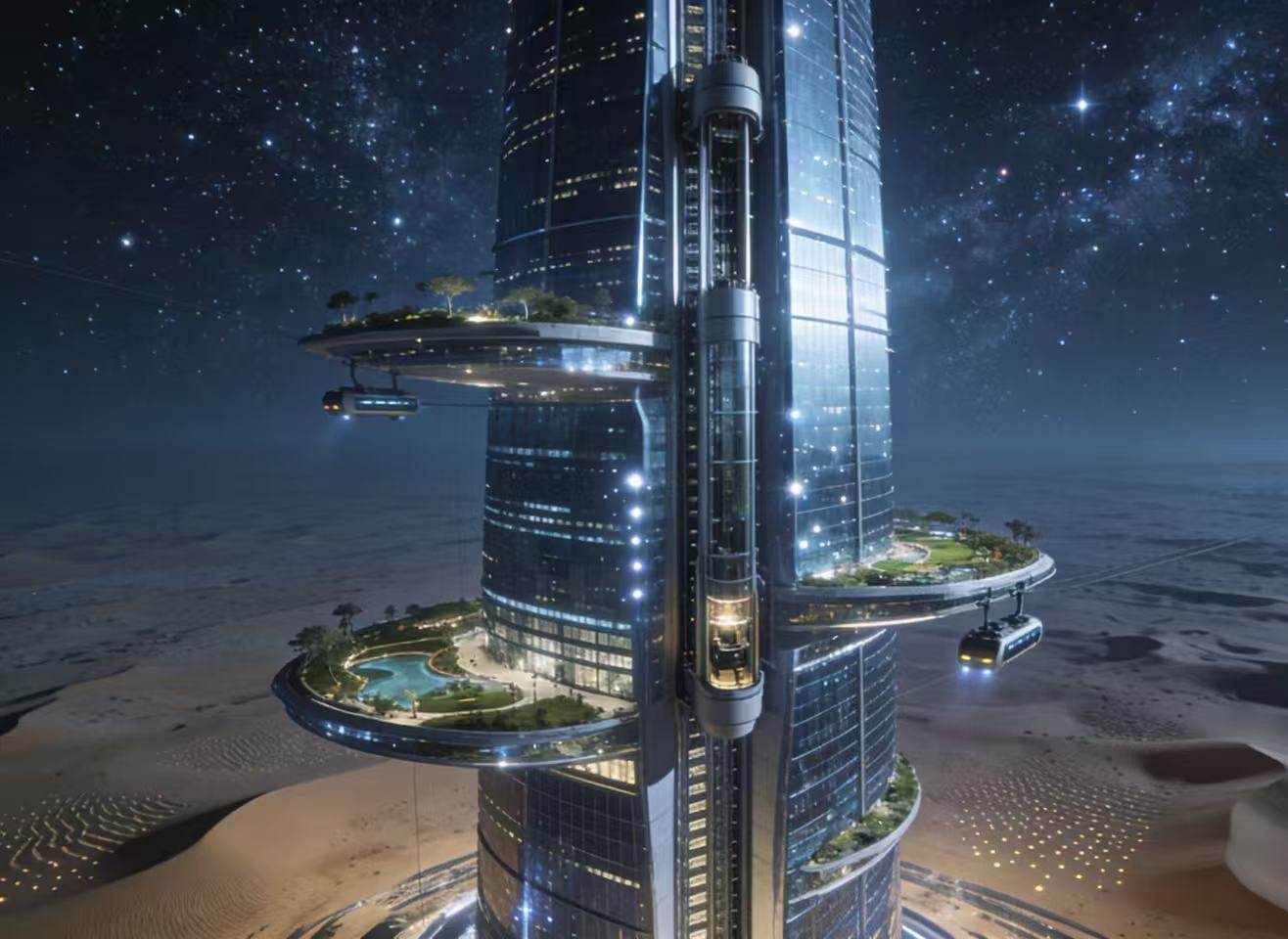 面对沙漠昼夜极端温差与沙尘暴环境,崛起塔采用耐高温、抗风化、高隔热的特种围护体系,兼顾结构耐久、节能舒适与环境防护,让超级建筑在严酷气候中稳定运行。它以垂直城市重构空间逻辑,每层都是微型社区,千米高空设置空中公园与观景平台,在云端营造人与自然对话的沉浸式场景,夜幕下与星空辉映,成为沙漠中最耀眼的未来灯塔。