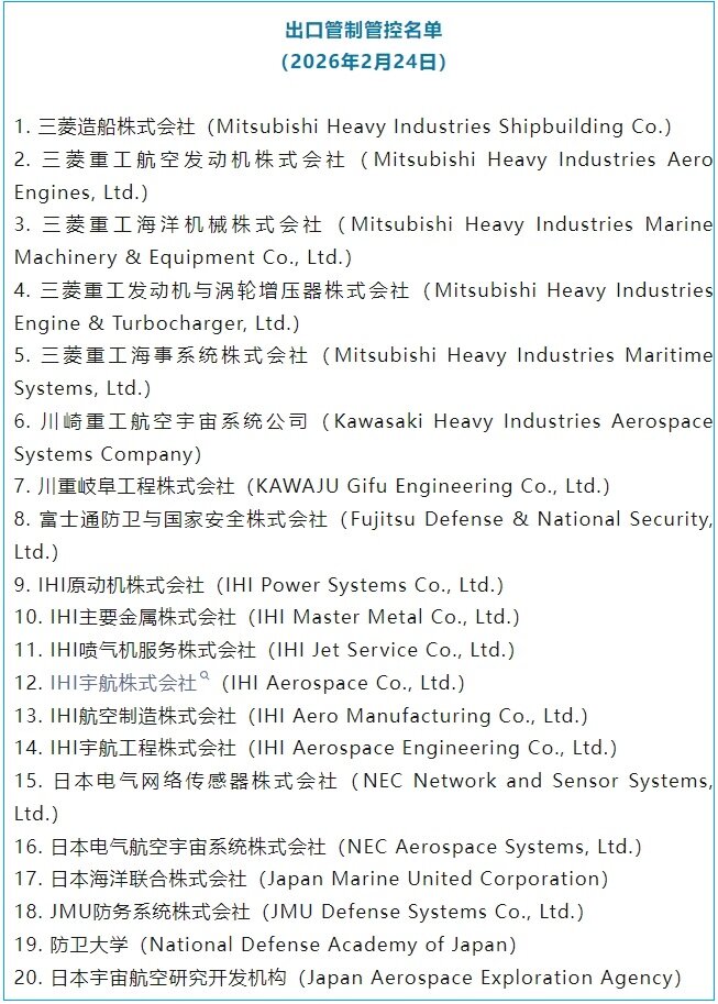 2026年2月24日,商务部发布2026年第11号公告,将20家日本实体列入出口管制管控名单。