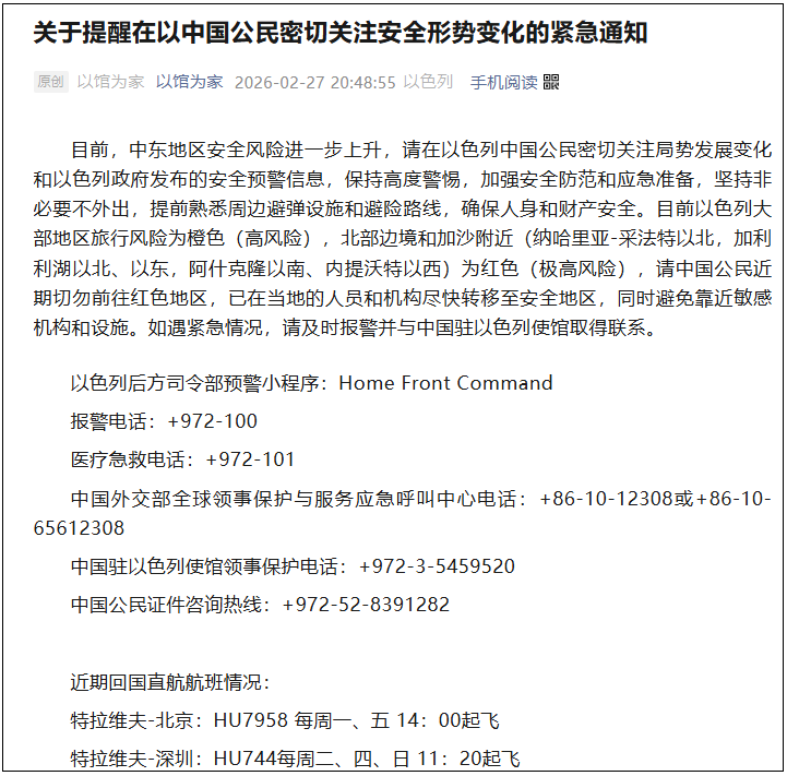 紧急提醒:当前中东地区安全风险进一步上升,请在以中国公民密切关注当地安全形势,及时关注以官方安全预警信息。请务必保持高度警惕,加强安全防范,做好应急准备。坚持非必要不外出,提前熟悉周边避弹设施与紧急避险路线,切实保障人身和财产安全。