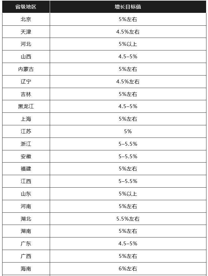 首先,我们对2026年全国经济增长目标值进行估计。一个重要的信息来源是各省、直辖市和自治区在各自省级人民代表大会上公布的2026年实际GDP增长目标。这些目标的表述形式多种多样,第一种是单一数字,例如5%;第二种是区间范围,设最低和最高值,例如5%至5.5%;第三种是5%左右;最后一种是高于5%。我们将5%左右的视为一个区间目标,上下浮动0.25。同样,我们将高于5%的也视为区间目标,上限为加0.25。根据这些设定,我们在2025年各地GDP加权平均基础上,得出2026年省级地区增长目标的最低值和最高值。表1列出了省级地区增长目标值及全国加权平均最低值和最高值。这些增速应该能反映实际情况,因为它们是省级领导的关键绩效指标。省级领导不太可能设定不切实际或不可行的目标,因为他们要对这些目标的实现负责。
